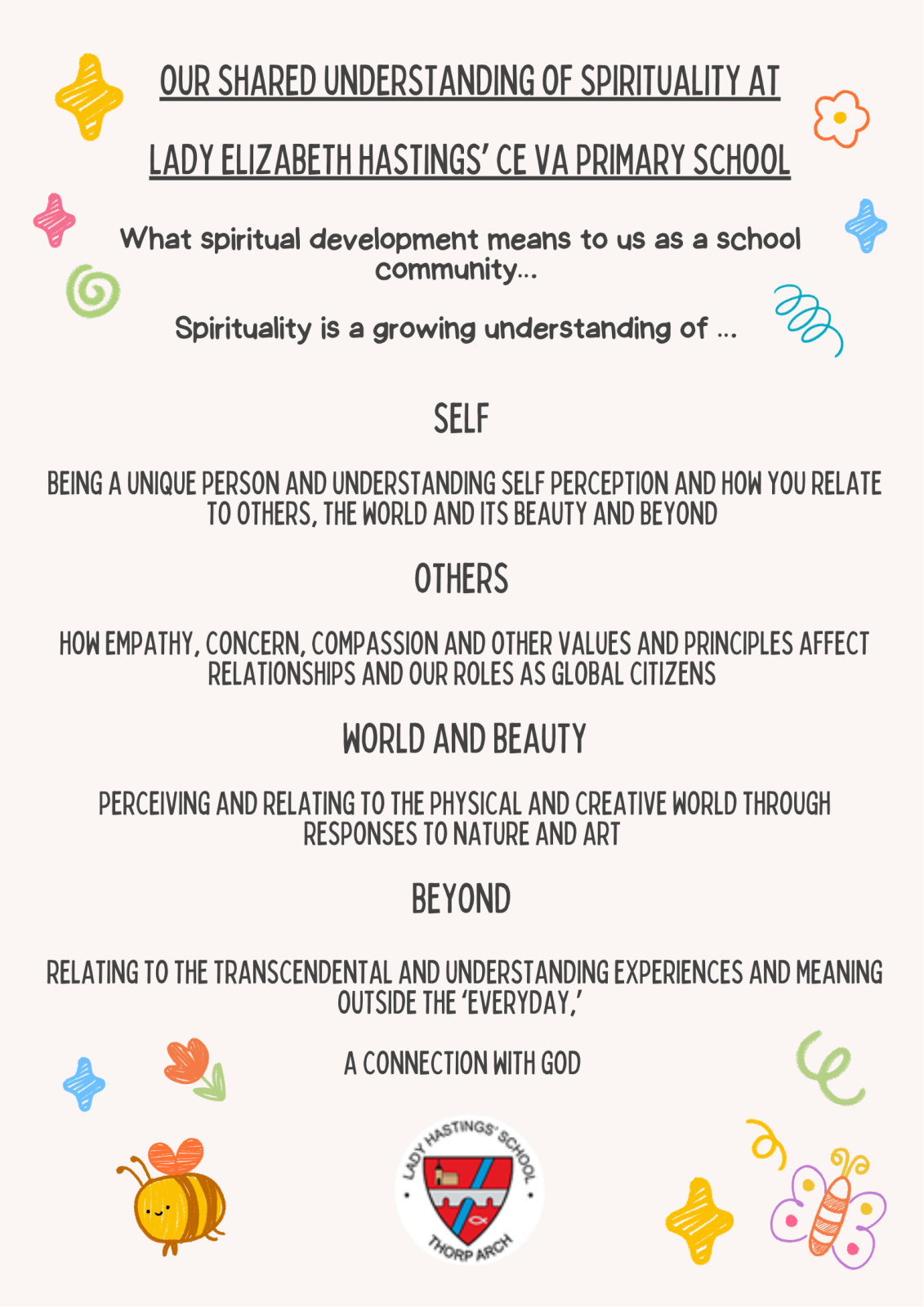 Opportunities for encouraging spirituality linked to the four areas of spirituality identified as self, others, world/beauty and beyond have been considered when planning our curriculum and are highlighted on each curriculum progression map.